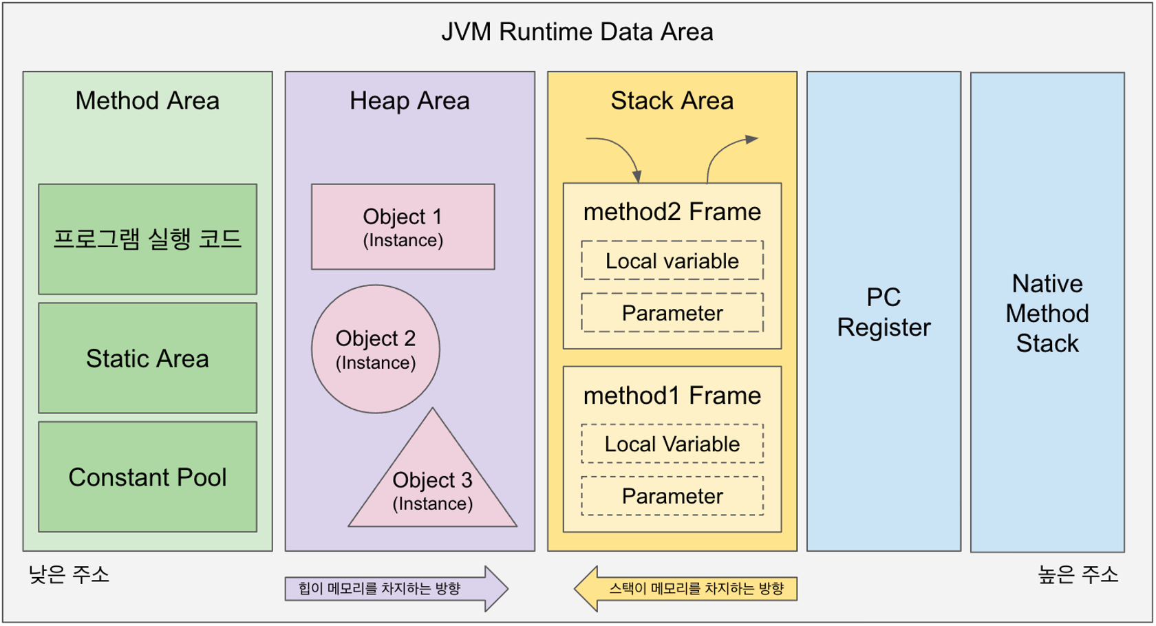 각 스레드 별 1개씩 스택 영역이 존재하고, 각 스택 영역 내의 Frame은 메서드 호출 시 생성 된 뒤 종료되면 제거된다.