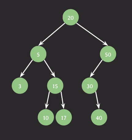 20 -> 5 -> 3 -> 15 -> 10 -> 17 -> 50 -> 30 -> 40