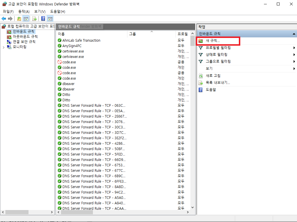 4.1. Window Defender 방화벽 -> 고급 설정 -> 인바운드 규칙 -> 새 규칙 클릭