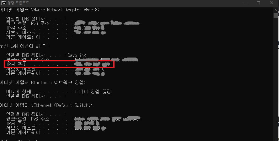 명령 프롬프트 실행 -> ipconfig -> IP 주소 확인