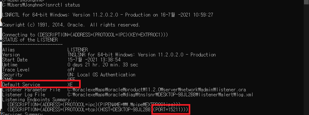 명령 프롬프트 -> lsnrctl status -> 포트 정보 확인