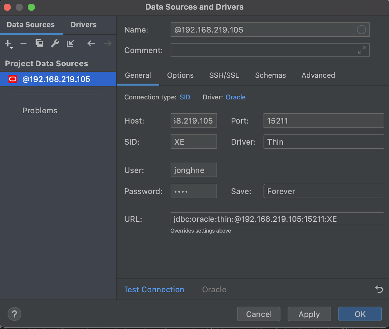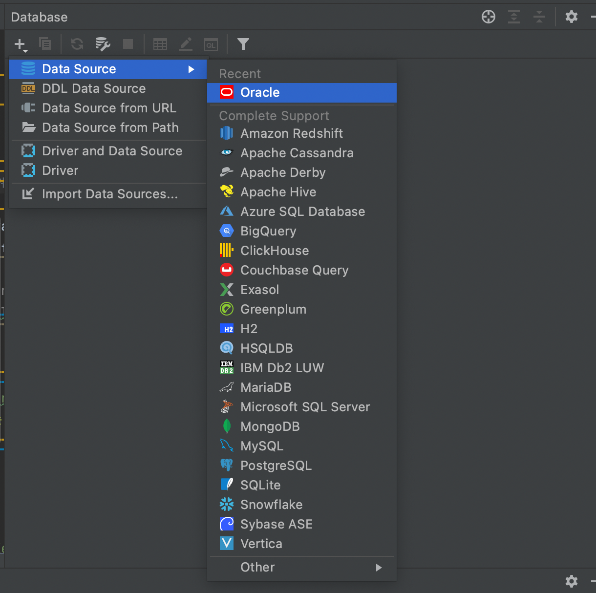 1. Database -> Data Source 추가 -> Oracle 클릭