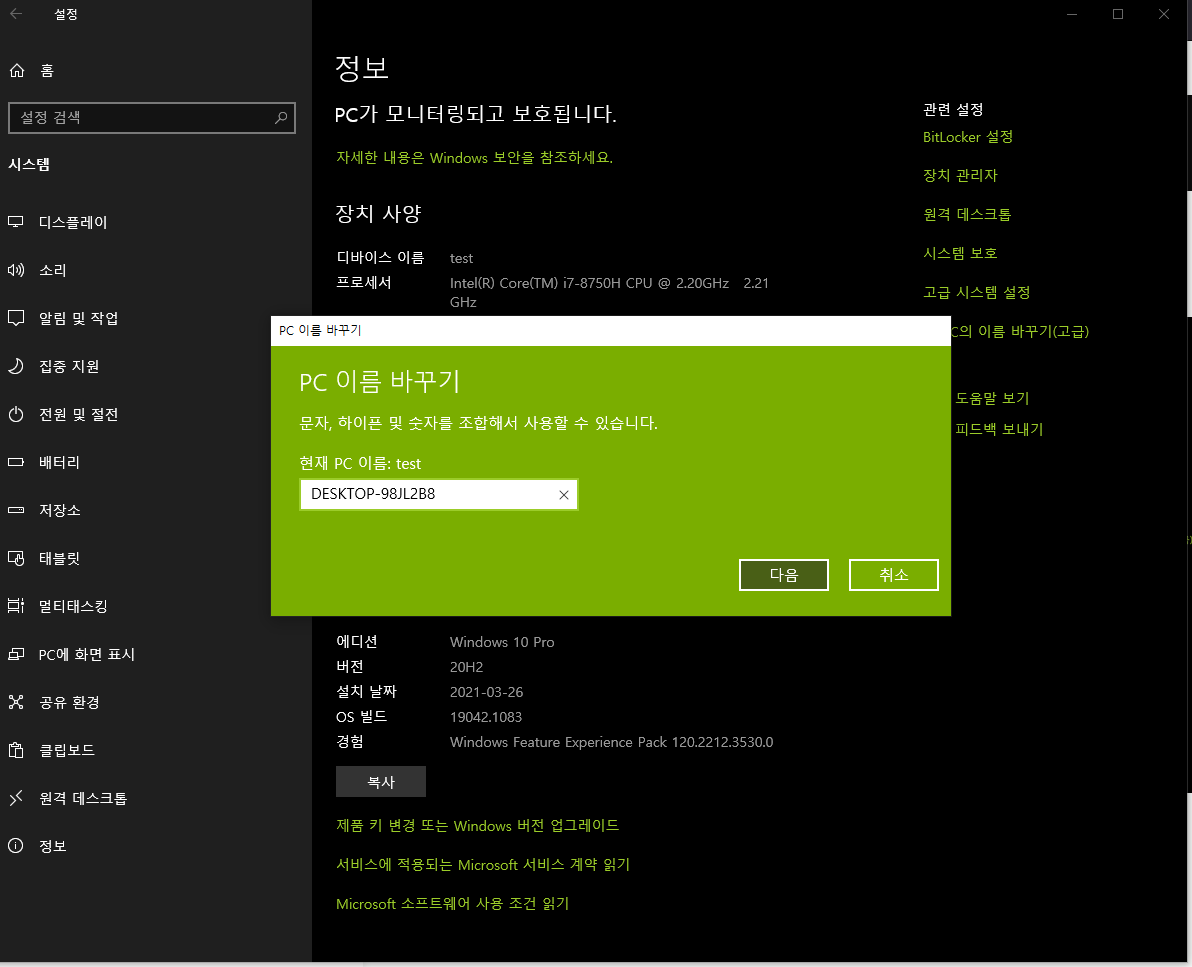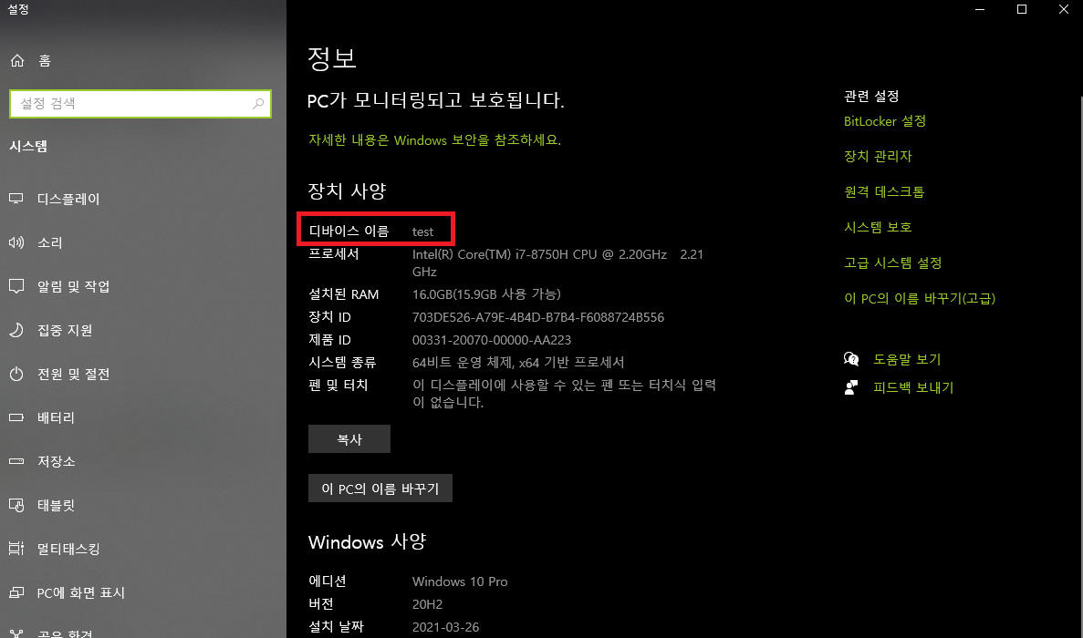 내 PC -> 속성 -> 정보 -> PC이름 바꾸기