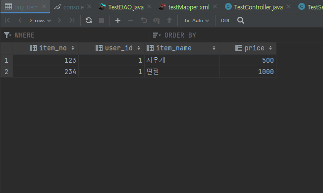 테스트용 테이블로 user 테이블과 buy_item 테이블이 있다고 했을때,