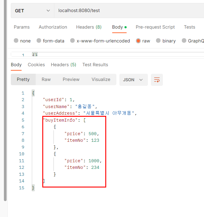 사용자 정보 1쌍에 구매 정보 N건이 조회되서 리턴되는것을 확인 할수있다.
