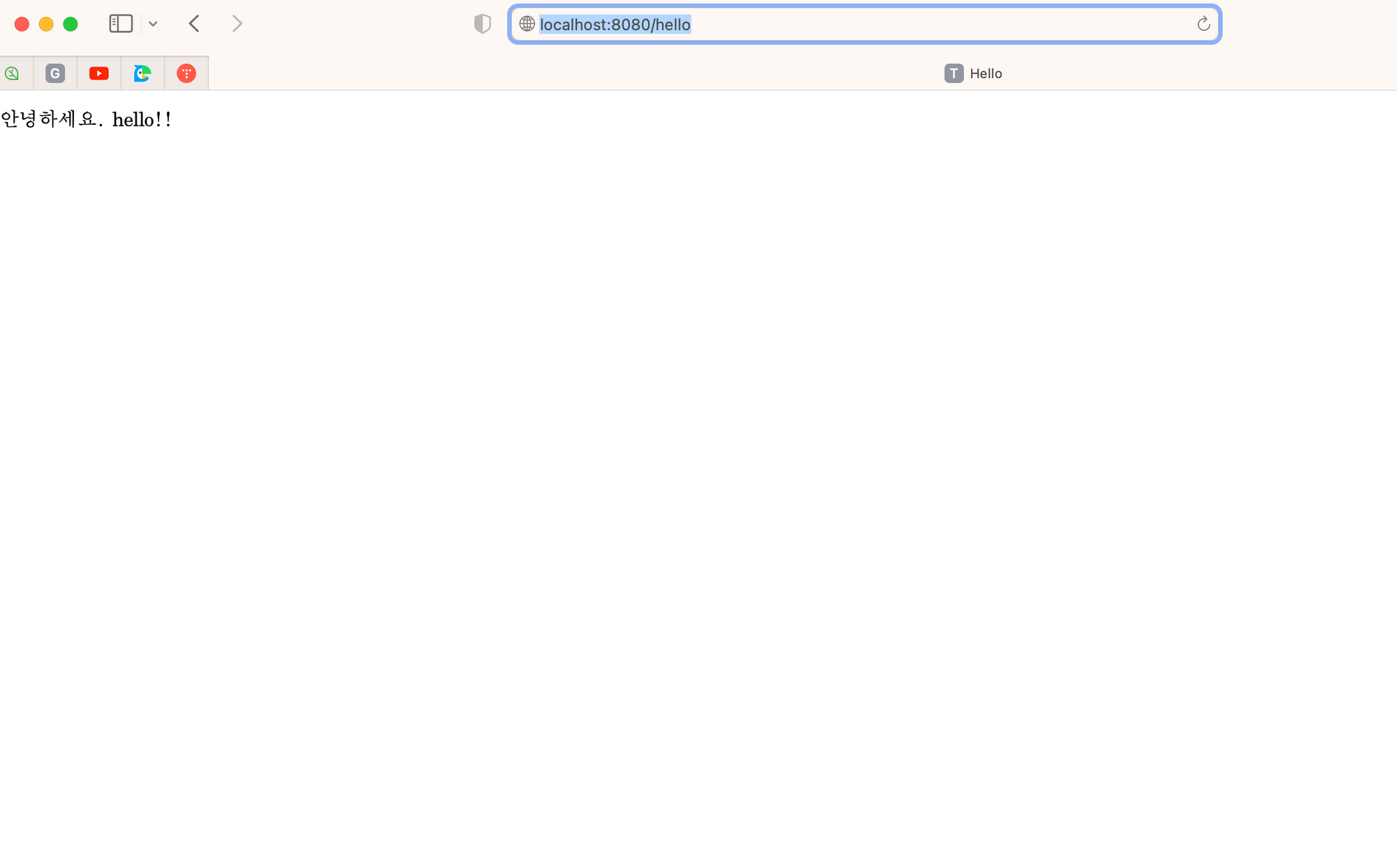 웹 브라우저에 localhost:8080/hello 를 입력하면 아래와 같이 결과가 나온다