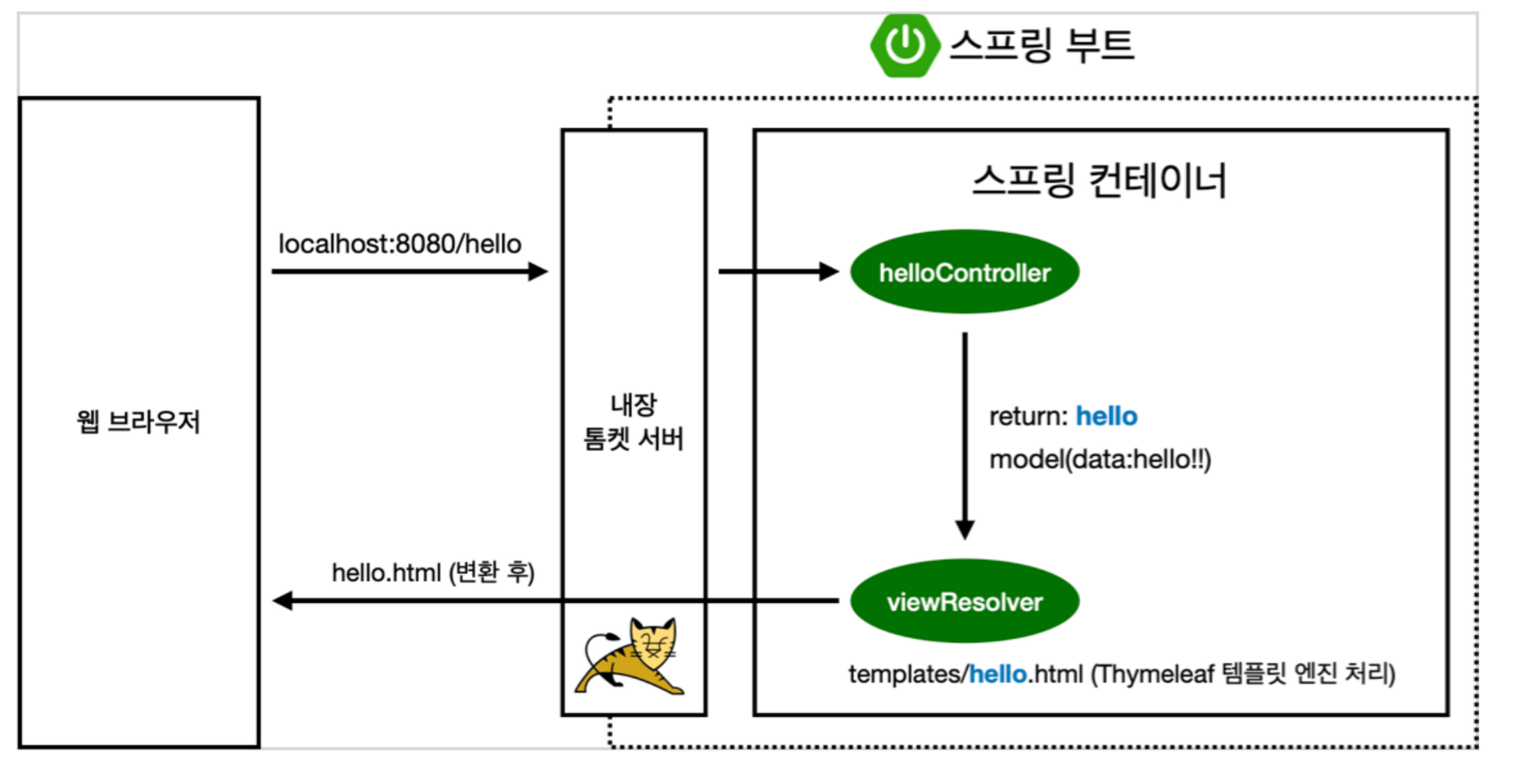 Model 객체에 attribute명 “data”에 “hello!!” 라는 데이터가 담긴 채 hello.html 파일로 전달된다.