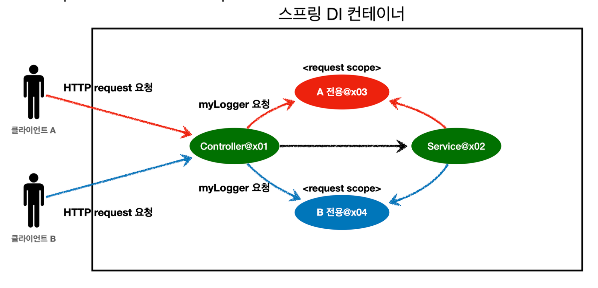 웹 스코프는 웹 요청이 들어왔을 때 빈이 생성되기 때문에, 다른 Controller, Service에서 주입시켜놓으면 오류가 발생한다.