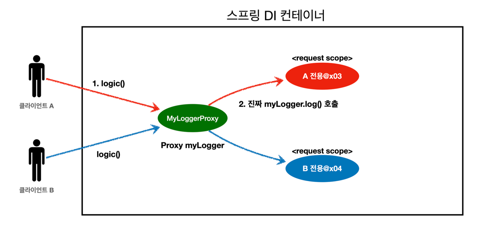 이렇게 어노테이션 설정 변경만으로 원본 객체를 프록시 객체로 대체할 수 있는 점은 다형성 + DI컨테이너가 가진 큰 강점이다. (이 Proxy는 웹 스코프가 아니어도 사용가능)
