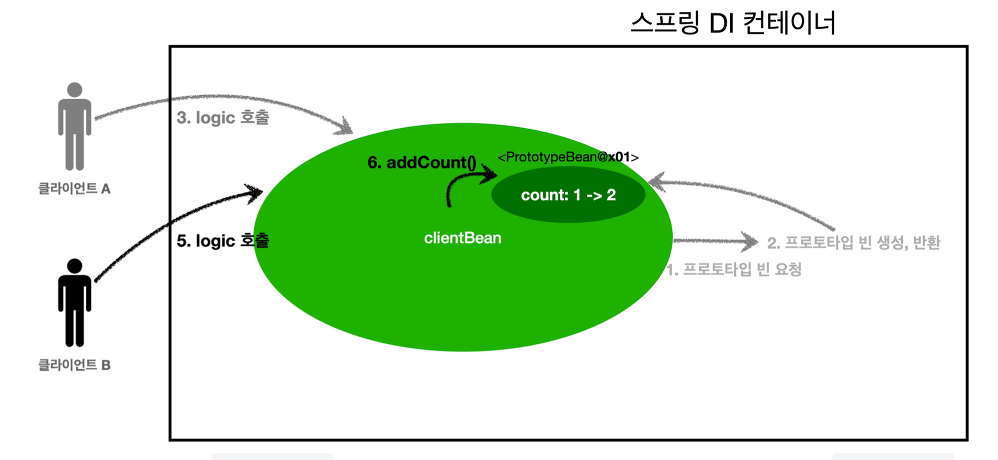 즉, 싱글톤 빈이 생성될 때 의존관계 주입 시점에 프로토타입 빈이 새로 생성되긴 하지만, 싱글톤 빈 내부에 있기 때문에 싱글톤 빈과 계속 유지된다.