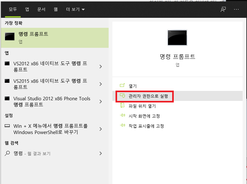 1. 명령 프롬프트를 관리자 권한으로 실행한다.