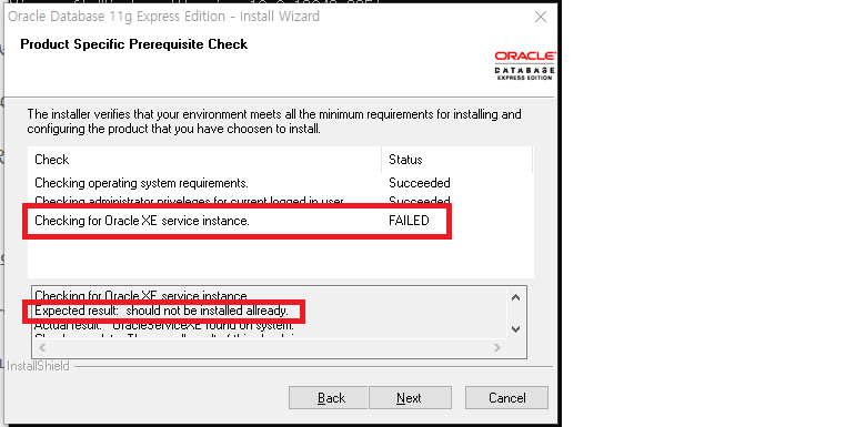 Oracle 11g을 삭제하고 재설치 하는 과정에서 아래와 같은 에러가 발생했다.